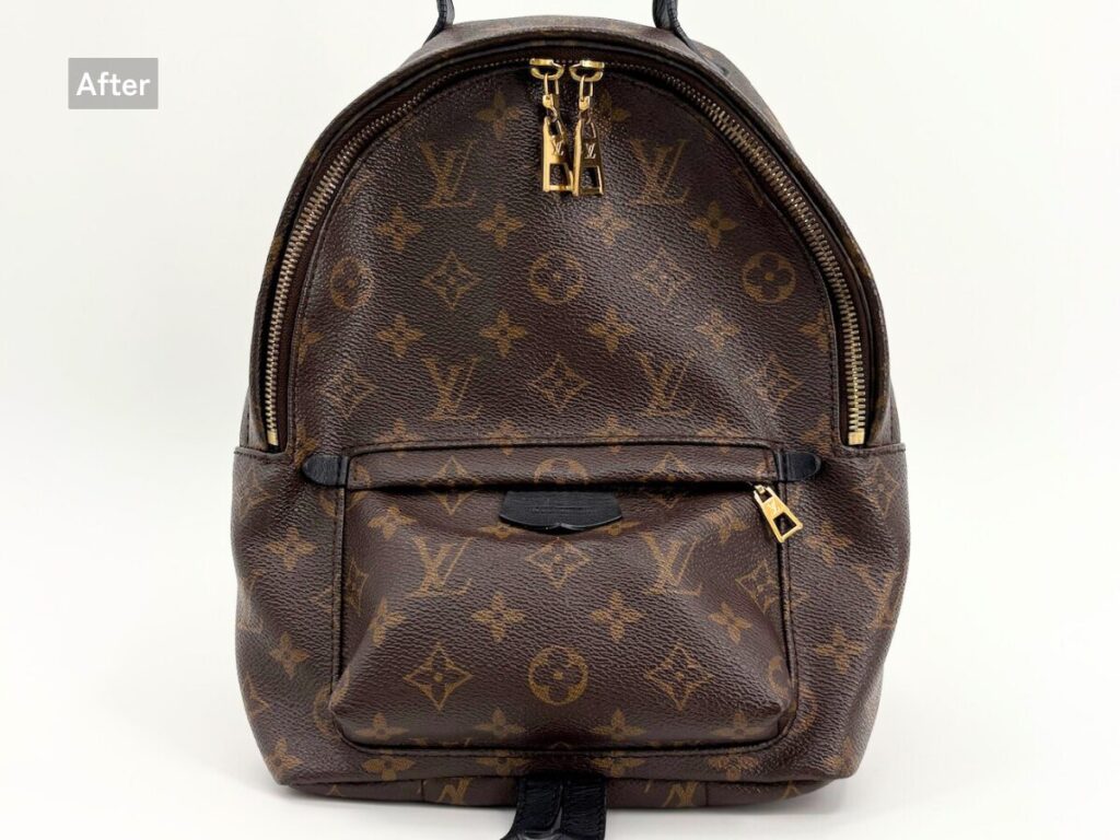 白く擦れていた部分が黒の深みを取り戻し全体の印象がぐっと引き締まった仕上がりに。色むらが出ないよう細かく調整しているため、バッグ本体とのバランスも自然で、違和感のない美しい仕上がりに。